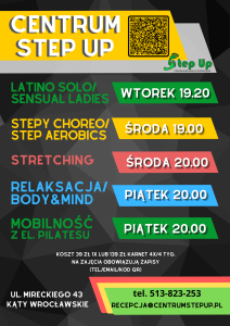 Zapraszamy dużych i małych do Centrum Rozwoju Osobistego Step Up. Zrób pierwszy krok w stronę doskonalenia swoich umiejętności. Skorzystaj z szerokiej oferty zajęć prowadzonych przez wykwalifikowaną kadrę. Zadbaj o swoje zdrowie, zdobądź nowe umiejętności, a przede wszystkim spędź miło czas razem z nami.